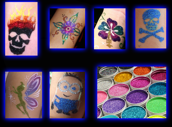 Now you too can shine like the stars! Get one of our new glitter tattoos with our new glimmer body art system. Comes complete with stencils and a variety of colors.